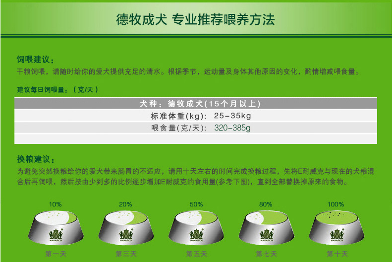 干糧飼喂,請隨時給您的愛犬提供充足的清水。根據季節、運動量及身體其他原因的變化,酌情增減喂食量。